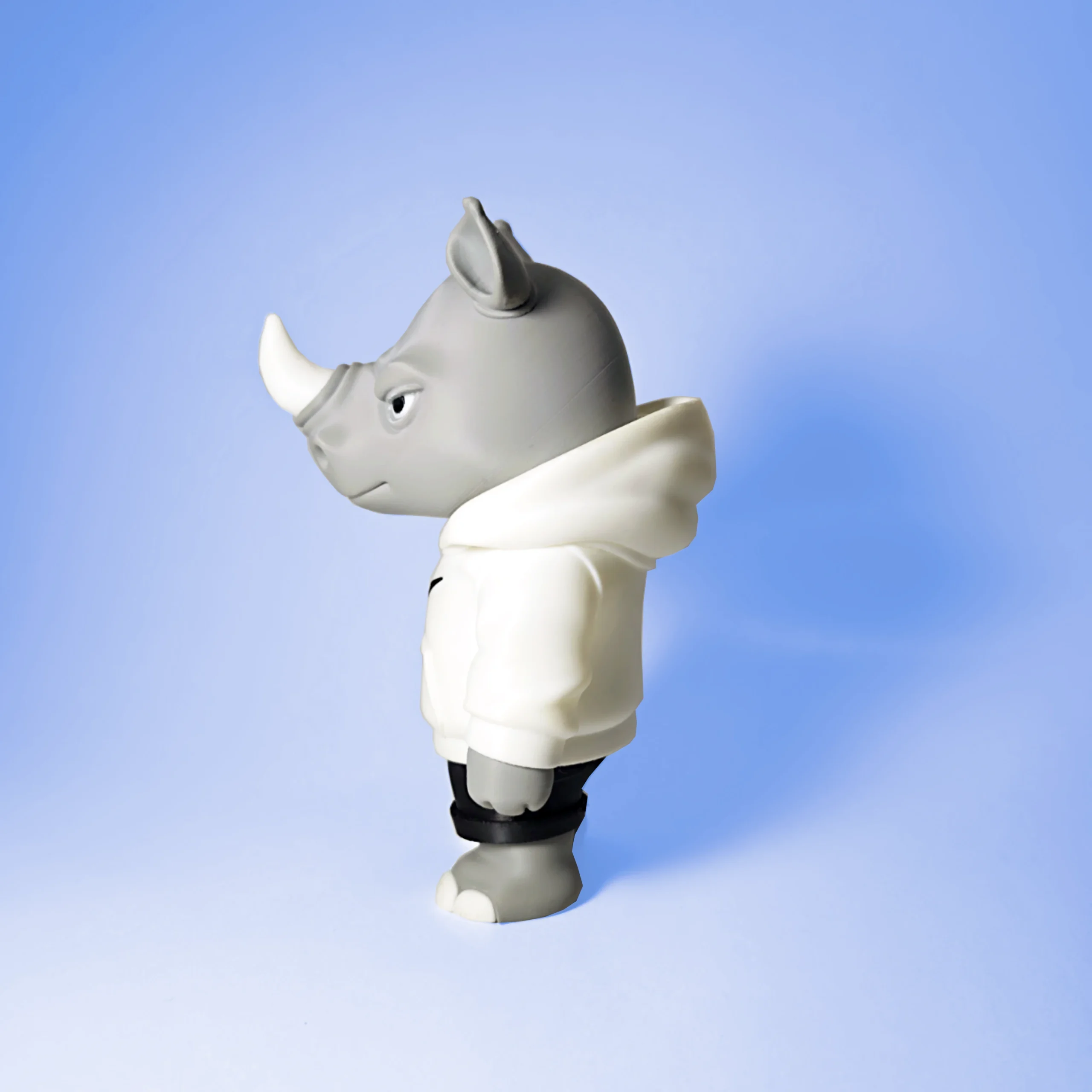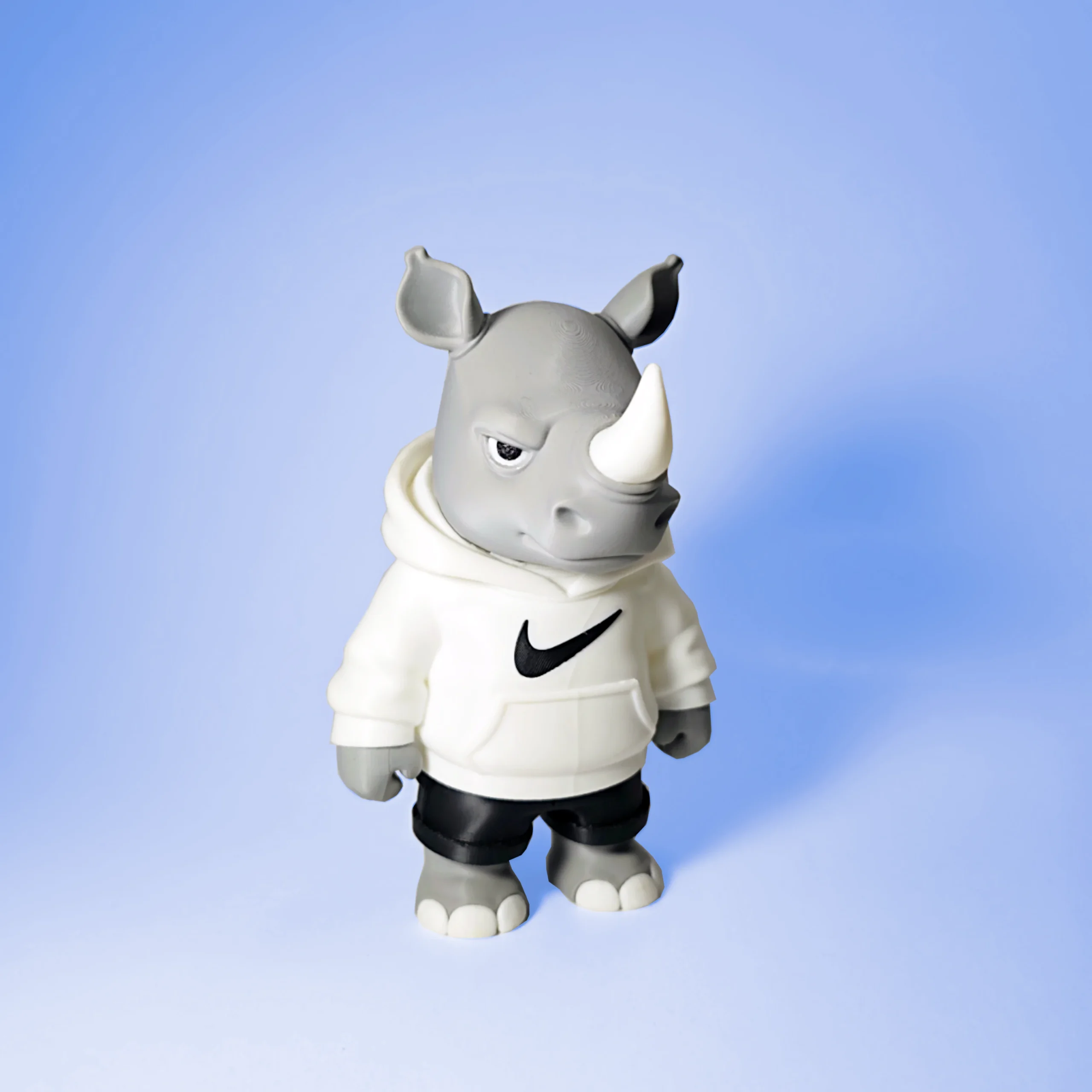 Esta figura de rinoceronte presenta un diseño moderno inspirado en la cultura urbana y el estilo street, combinando una estética divertida con un acabado limpio y detallado.